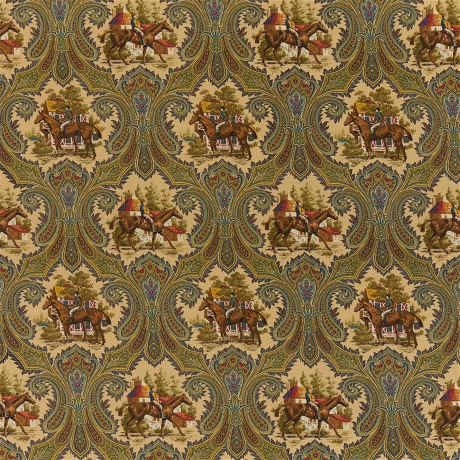 • Pattern: A detailed repeating design featuring riders on horseback set against an architectural and natural backdrop, all framed by an elaborate, swirling Paisley pattern.